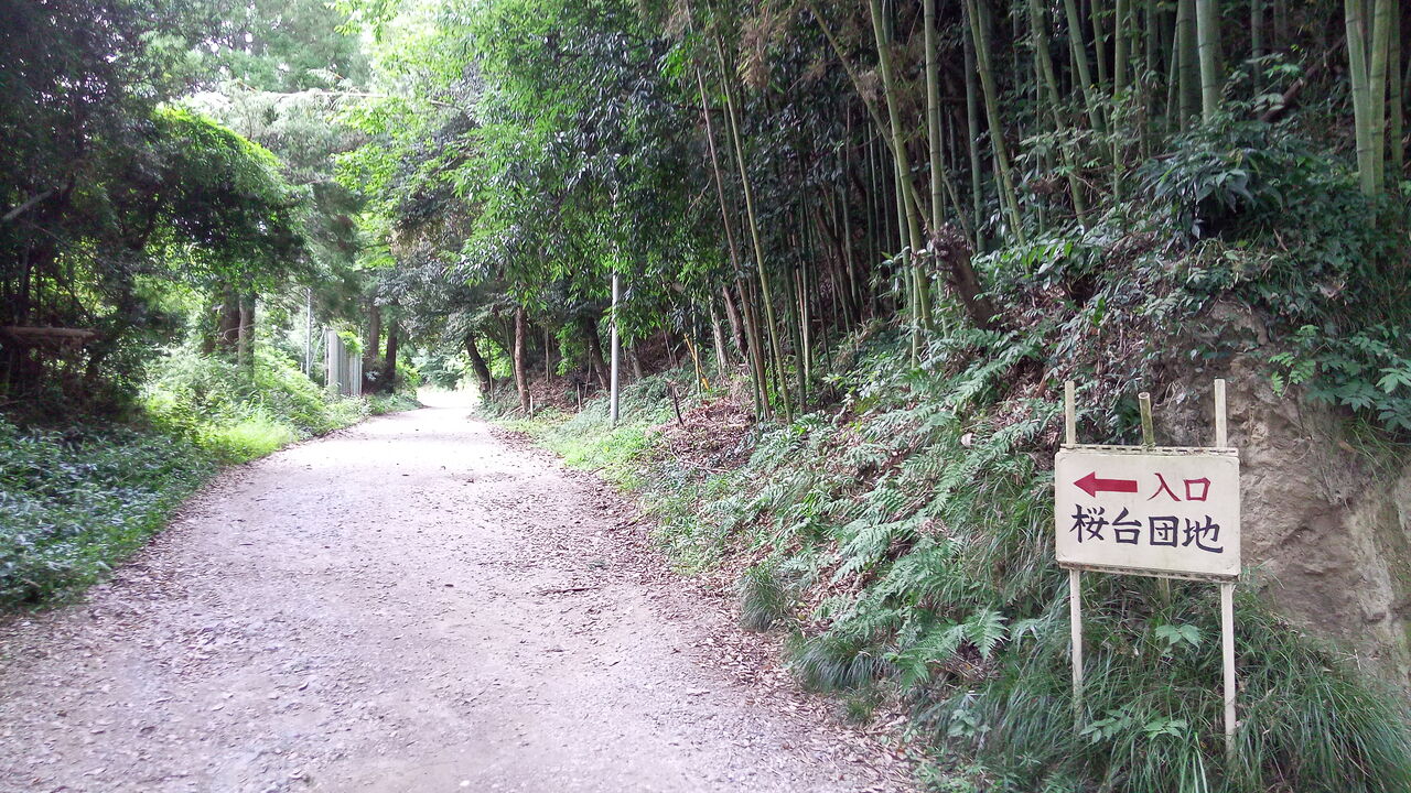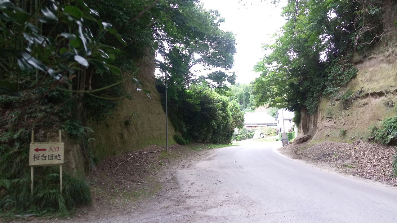 桜台団地へのもう一つの入口である、先述のきららのくに側からの団地の進入路は、房総半島の中南部でよく見かける、切り通し道路の脇にある。鬱蒼とした未舗装道路の入口に、先の福俵駅側のものと同様の手書き看板があり、それは住宅団地と言うより、遺跡や鍾乳洞の案内看板かと見紛うばかりで、とてもこの先に住宅団地が存在するとは思えない野趣溢れるロケーションである。