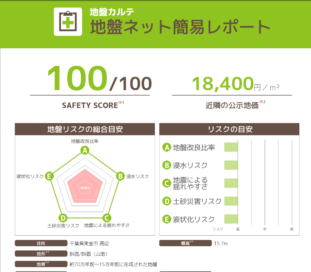 実際桜台団地は、住所を入力するだけで簡易的な地盤や災害リスクの診断を出してくれる民間業者のサイト「地盤カルテ(https://jibannet.co.jp/karte/)」を利用してみても、その診断結果は、すべての災害リスクが低く抑えられた100点という素晴らしいものだ。
