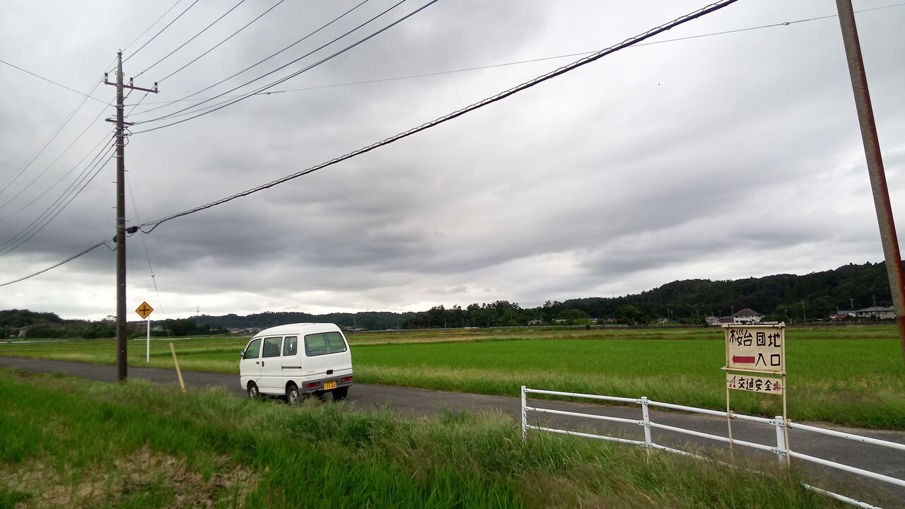 福俵駅側から桜台団地に向かうには、田んぼの中の道を抜けて行くことになるが、幹線道路でもなく分かりにくいためか、田んぼの途中に手製の案内看板が立てられており、時折団地方面に向かって住民のものと思われる車が走行していく。案内看板の位置からでは団地の模様ははっきり確認することができず、本当にこの田んぼの先に住宅団地があるのかと一瞬不安になるような立地だが、しかし実はこの福俵方面からの入口はまだノーマルな方である。
