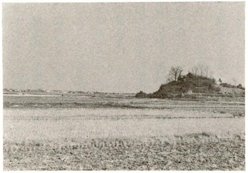 大網白里市養安寺方面より撮影された、東金市山口字島ノ越、島ノ越遺跡の発掘調査が行われた丘陵の写真。写真を見る限り桜台団地が開発された丘陵と思われるが、現時点では確証が取れなかった。(1980年代初頭撮影(推定)・『大網白里町史』より転載)